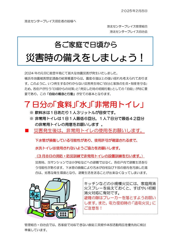 しかし災害時すべての方がマンション内に在宅とは限りません。自らの安全確保を済ませた、マンション在宅者で構成する組織です。