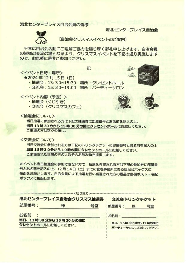 2024年 · 2024/12/15 クリスマスイベント開催します! 🎄🎅🏻クリスマス イベント🎅🏻🎄 日時:2024年12月15日 場所:クレセントホール 時間:10:00~15:00 ・クリスマス抽選会・音楽イベント Image_20241123_0001.pdf PDFファイル 229.7 KB ダウンロード tagPlaceholderカテゴリ: