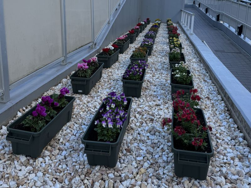 プランターの数、花苗ともにお任せいただきましたので、プランター30個を新たに用意し、ヨネヤマプランテーションで購入した花苗(ネメシア、ビオラ、ガーデンシクラメン)を植えました。